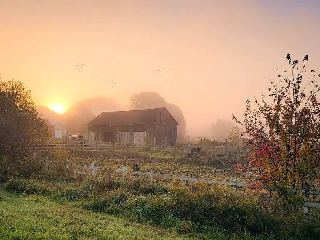 Foggy sunrise behind a barn